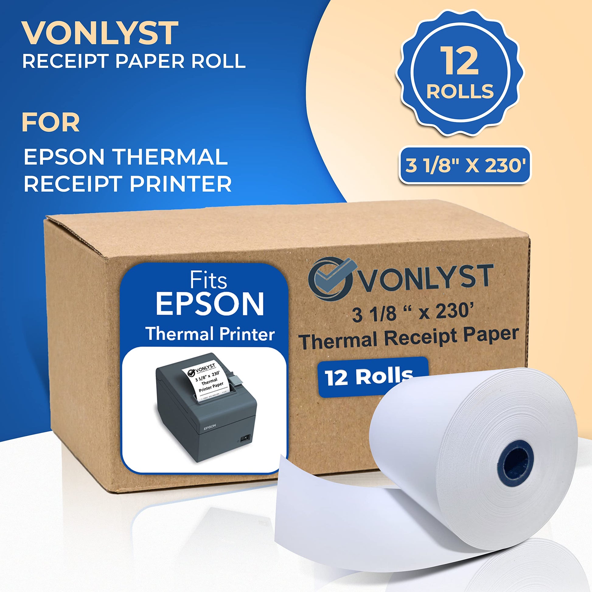 Vonlyst 3 1/8 x 230 Thermal Paper Receipt Roll for Epson Printer (Pack 12 rolls)
