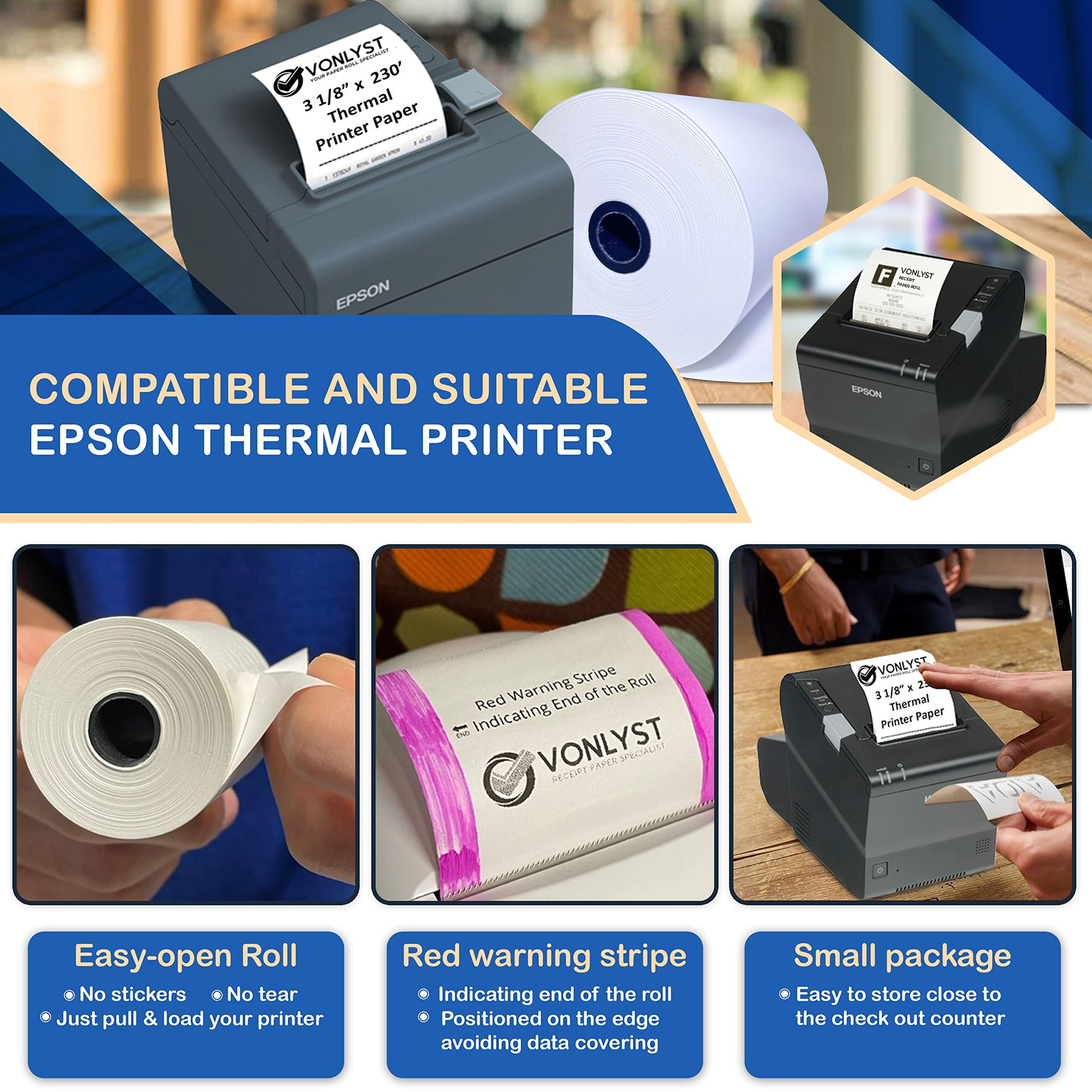 - EASY-OPEN ROLL no stickers, no cut requiring, just pull the paper roll and load your Epson Thermal Printer. Vonlyst thermal paper rolls come with a red stripe mark positioned at the edge of receipt paper to avoid covering data, this red mark indicates the end of receipt paper roll and paper has a free end release eliminating paper jam. Vonlyst thermal paper roll for Epson Printer is built to use from the beginning till the end with guaranteed 230 feet long of paper per roll